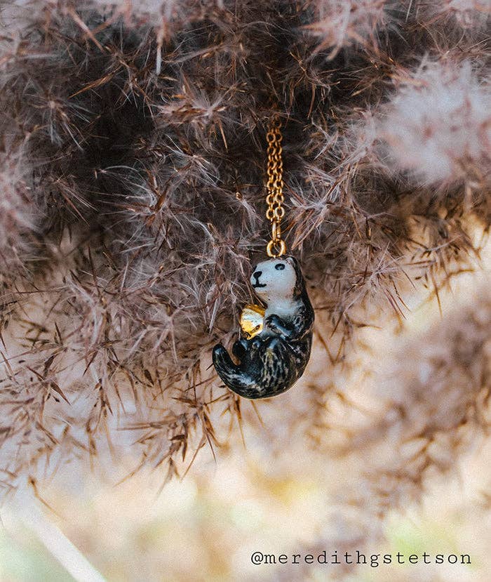 Necklace; River Otter By Camp Hollow (24K Gold Steel Chain, Hand-Painted Porcelain)