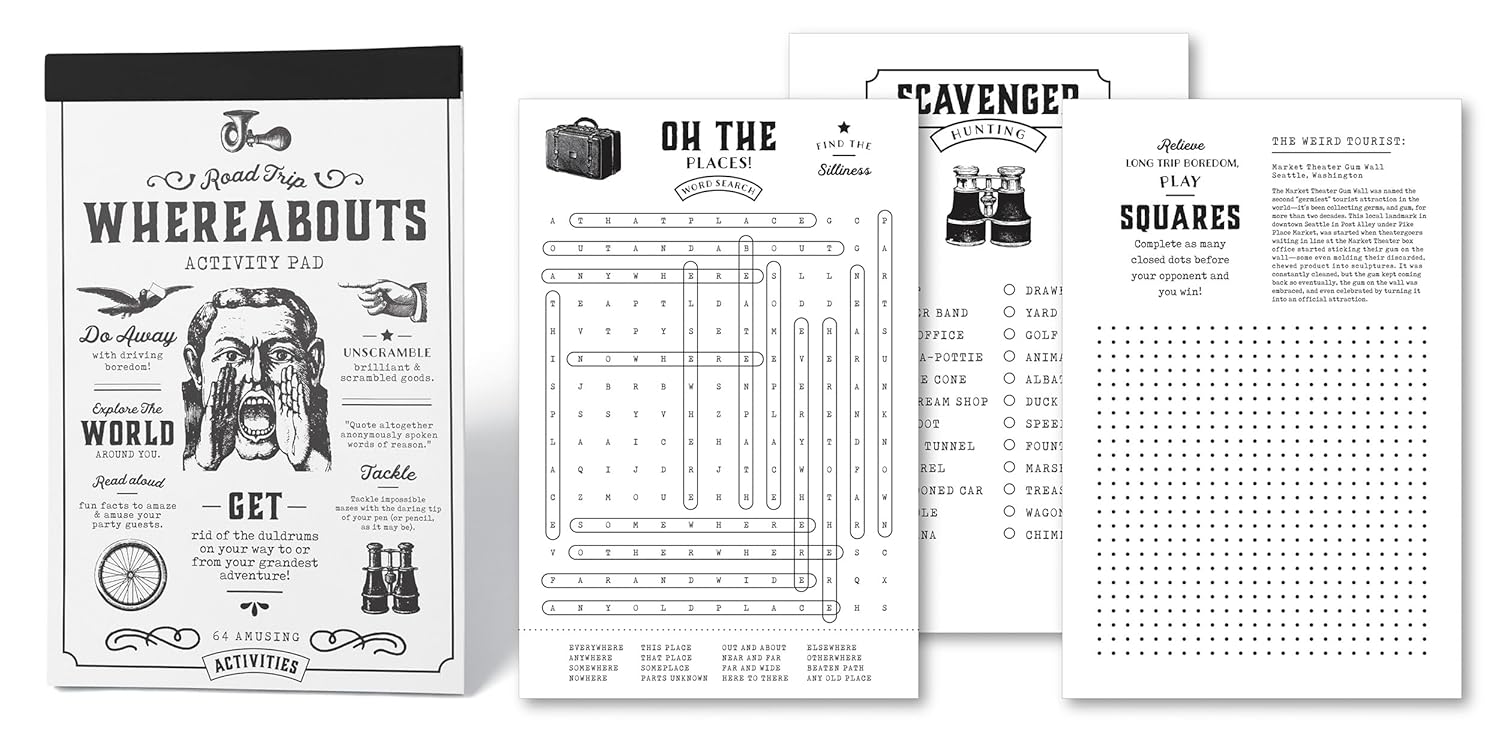 Made in the USA. Jam-packed with games for hours of fun, perfect for a long drive, camping trip, or even a rainy day to keep your mind sharp. Includes special road-trip versions of bingo, alphabet games, word searches, doodle pages, mazes, scavenger hunts, brain teasers, and more.
