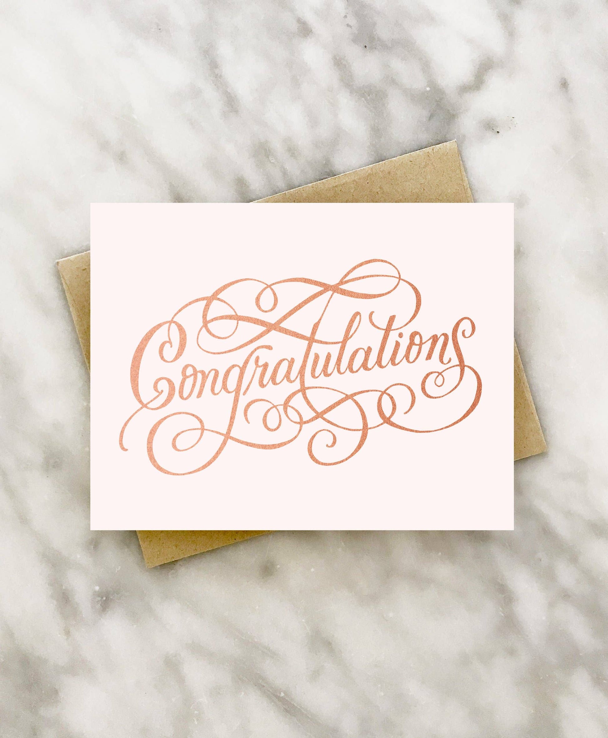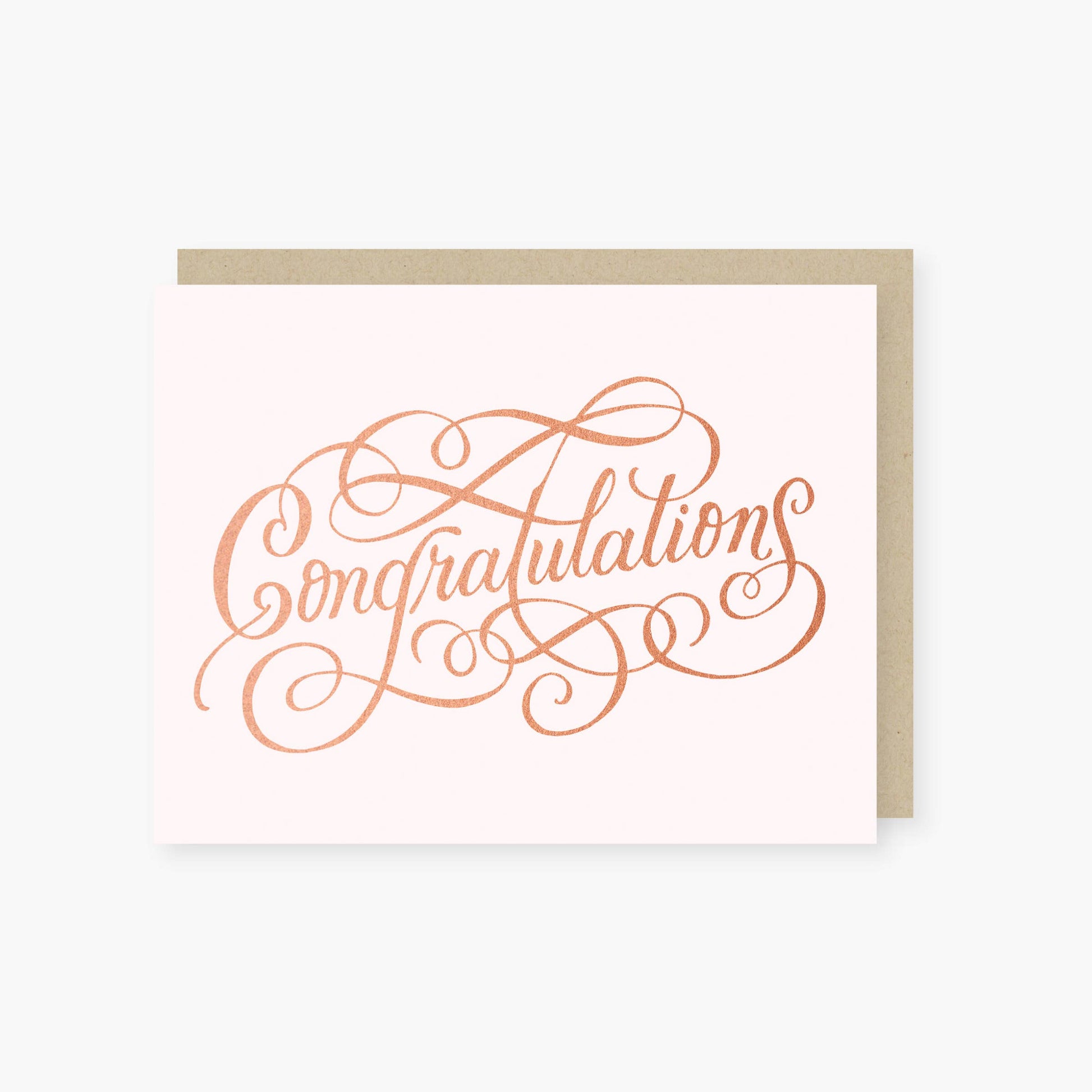 Send your message of congratulations with this gorgeous, hand lettered card. Rose gold foil on a blush background. Elegant and timeless.