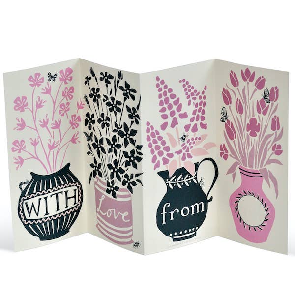 These extra-special, double-sided, foldy concertina cards are of 300gsm smooth ivory uncoated stock, litho-printed in England on responsibly sourced stock in vegetable oil-based colours that are friendly to the environment. It has no particular message but there are places to write your name and the name of the recipient on the vases of the flowers. When folded, this card measures 90 mm wide x 180 mm tall. Each card is supplied with a cream diamond flap envelope, and is individually wrapped.
