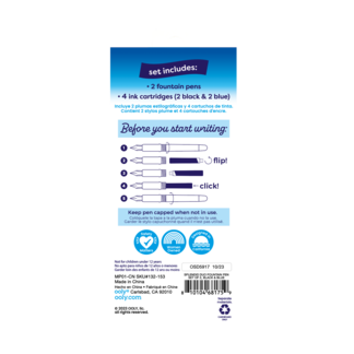 * Fountain Pen Set * Includes 2 pens and 4 cartridges; 2 black and 2 blue * Keep pen capped when not in use * Refillable cartridges click into place * Suitable for age 12 and up.