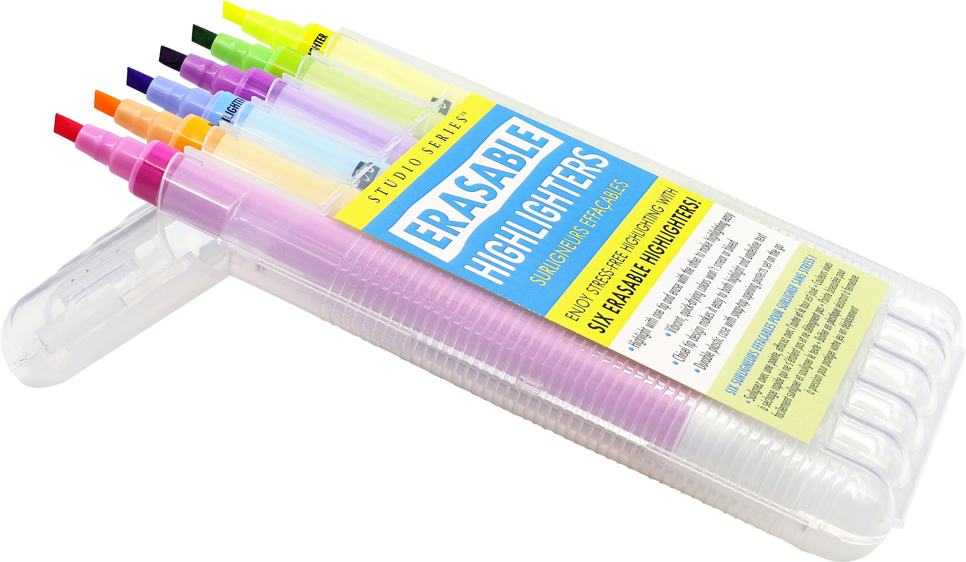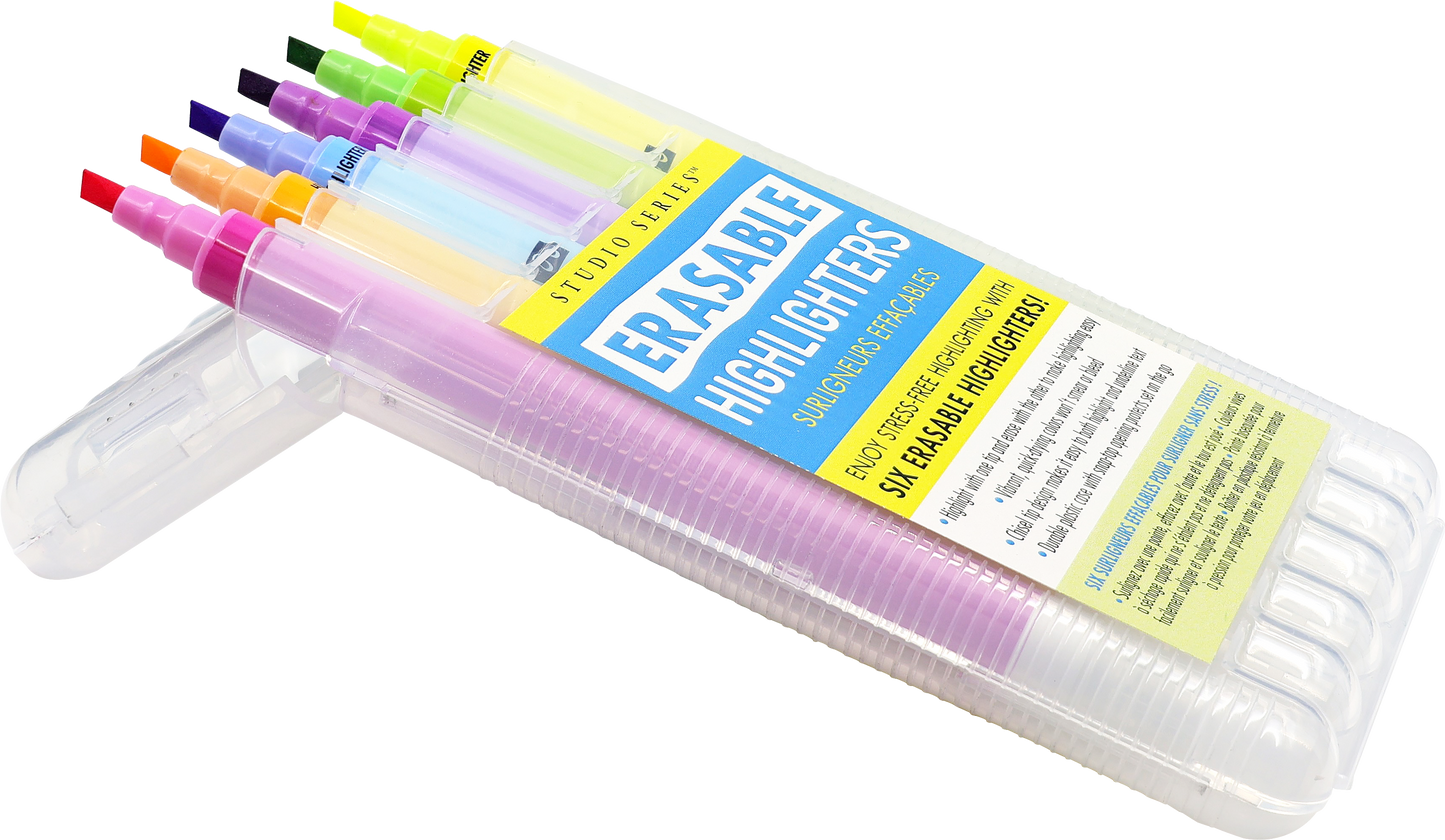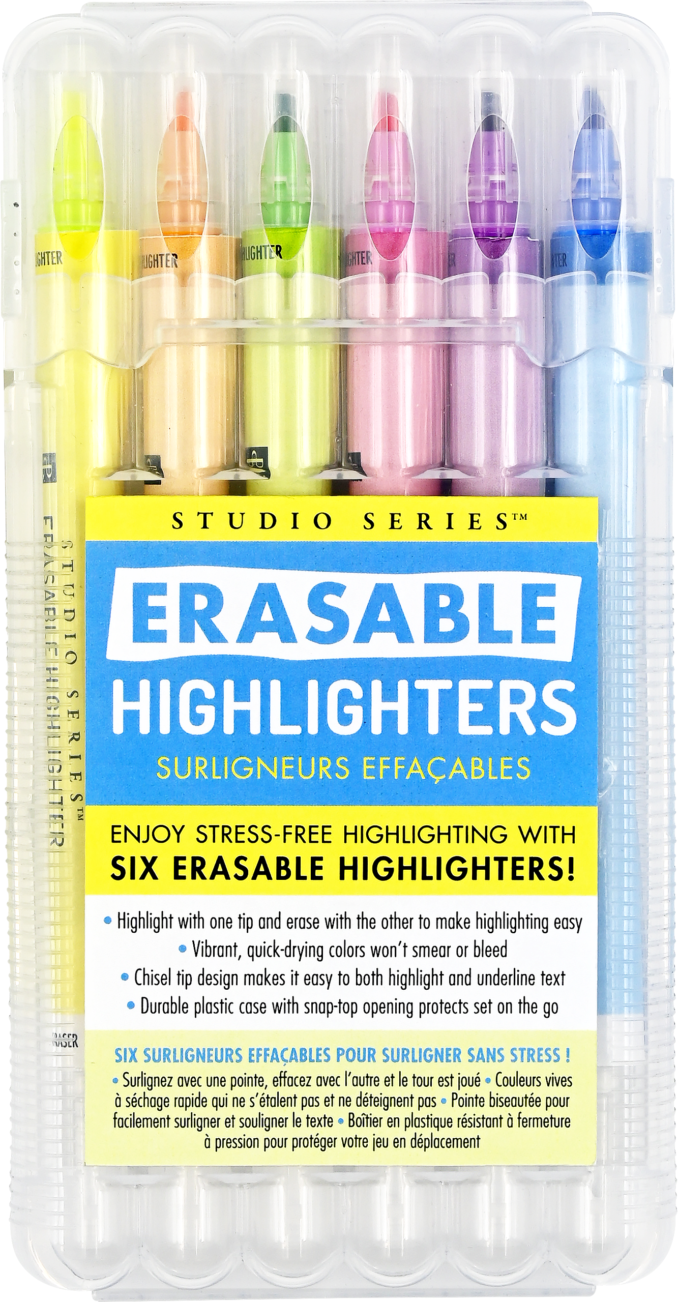 Enjoy stress-free highlighting with this handy set of 6 Erasable Highlighters ! Highlight with 1 tip and erase with the other to make highlighting a breeze! Made a mistake? No problem, just erase! 6 vibrant, quick-drying colors won't smear or bleed. Chisel-tip design makes it easy to both highlight and underline text. Great for studying, planning, dot journaling, note-taking, and more! Durable plastic case with snap-top opening protects your set on the go. Non-toxic. Conforms to ASTM D-4236.