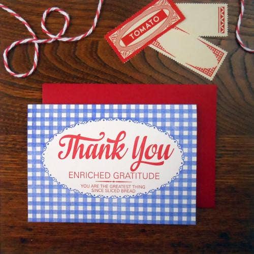 This darling card features a renowned bread bag design... and truck. It's printed with 2 lively colors on premium white cardstock, and comes with a crimson envelope and blank inside.