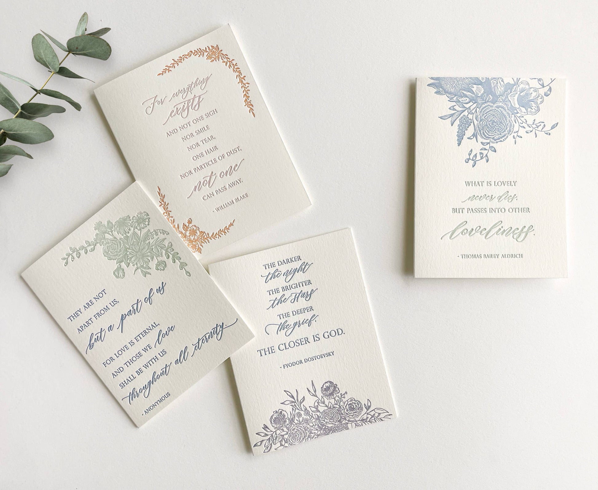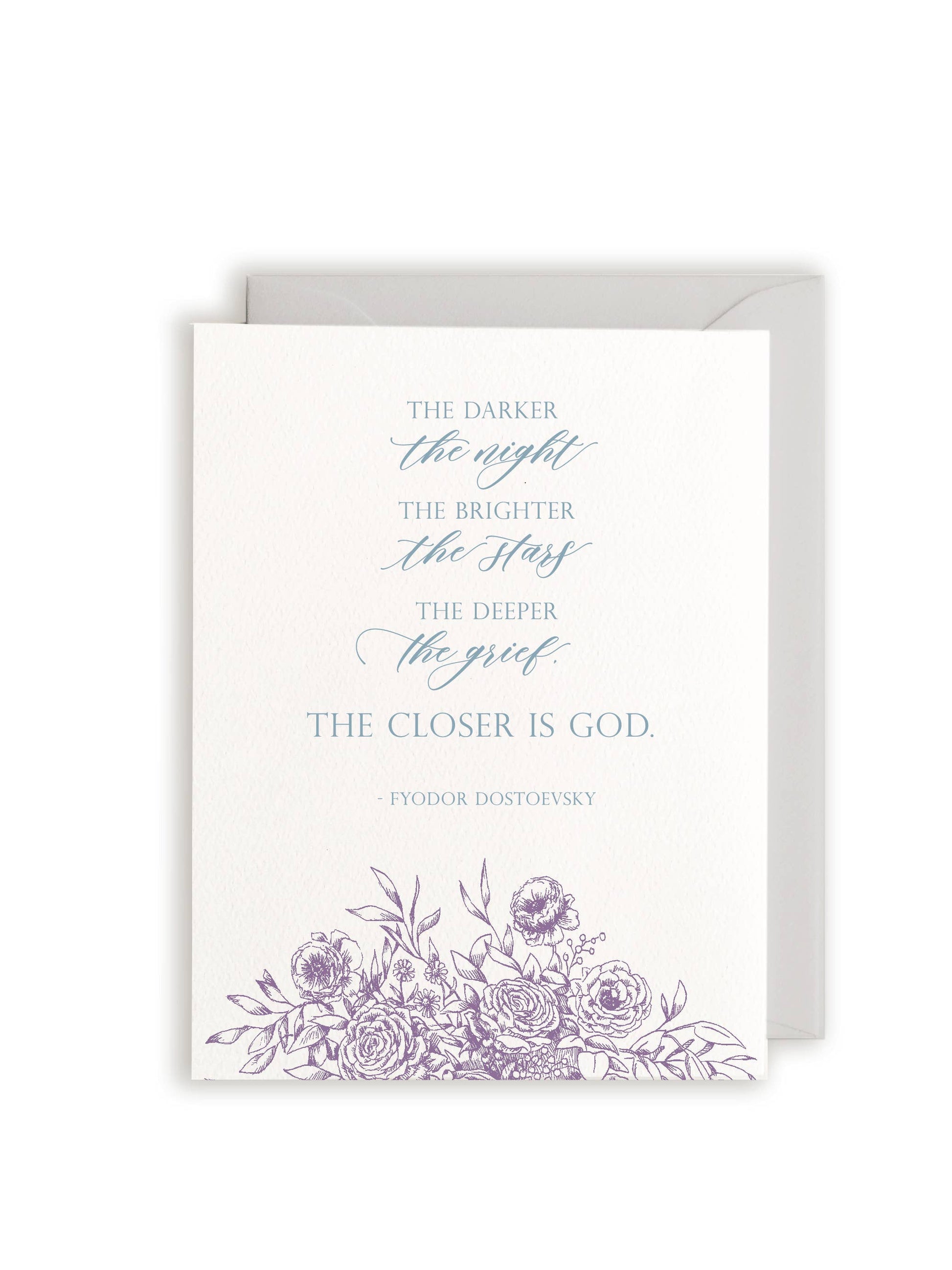 "The Darker the Night, The Brighter the Stars, The Deeper the Grief. The Closer is God. - Fyodor Dostoevsky" Letterpress Greeting Card Let someone you love know you're thinking about them with this beautiful and sentimental greeting card. Original floral artwork created by Rust Belt Love. These two color cards are handmade and pressed one at a time on antique presses. Premium quality cotton paper.
