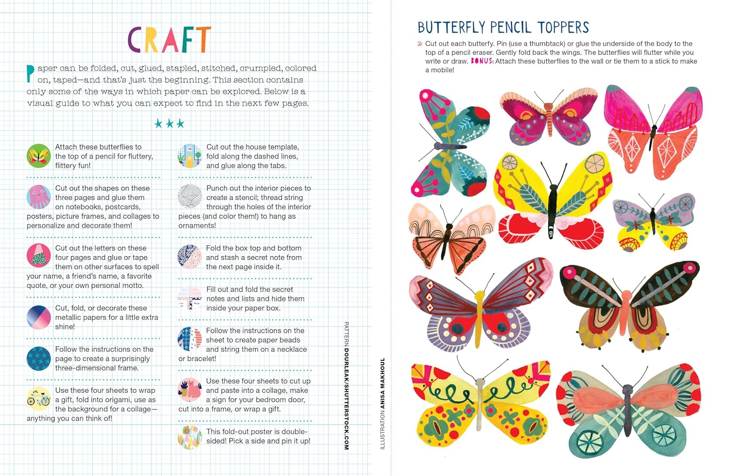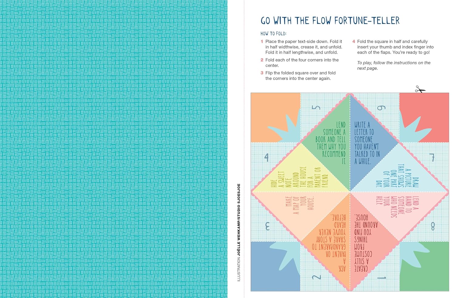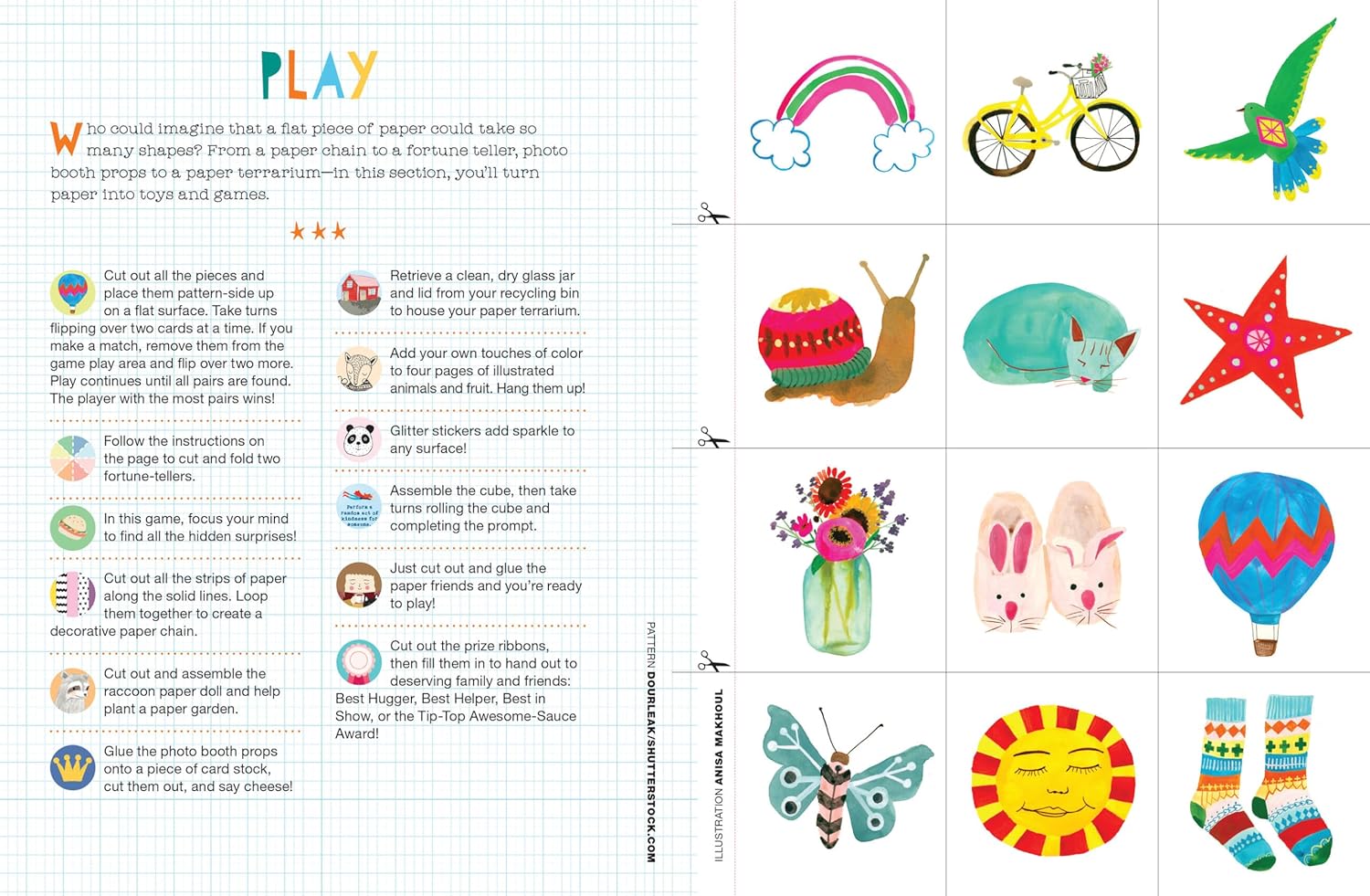 Loop paper strips into a paper chain. Snip out bookmarks. Fold a paper house. Make photo booth props—a silly mustache, a crown—to pose with friends. Bind up a DIY storybook and use it to sketch out adventures and dreams. Construct a paper flower bouquet, a paper terrarium, a fortune-teller with prompts like Lend someone a book and tell them why you recommend it.