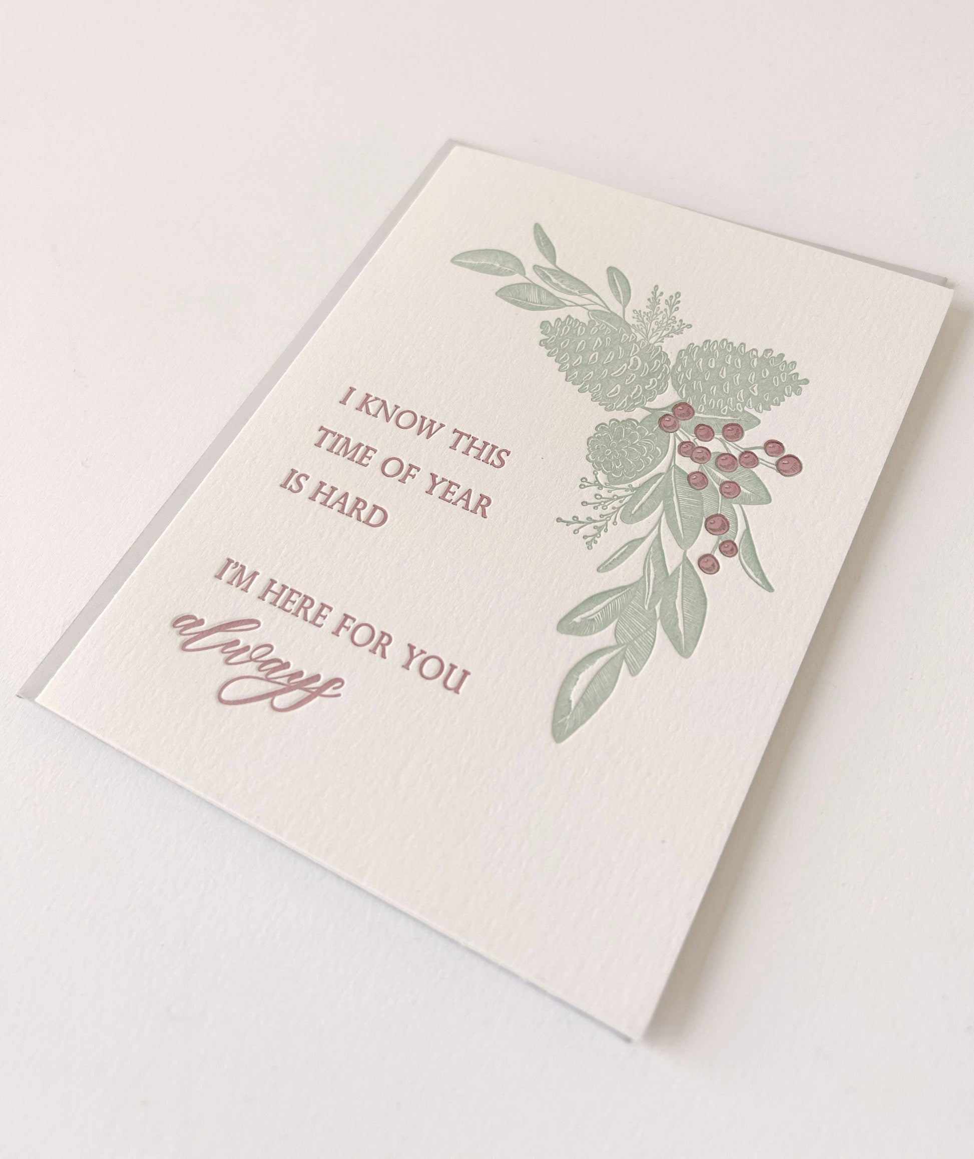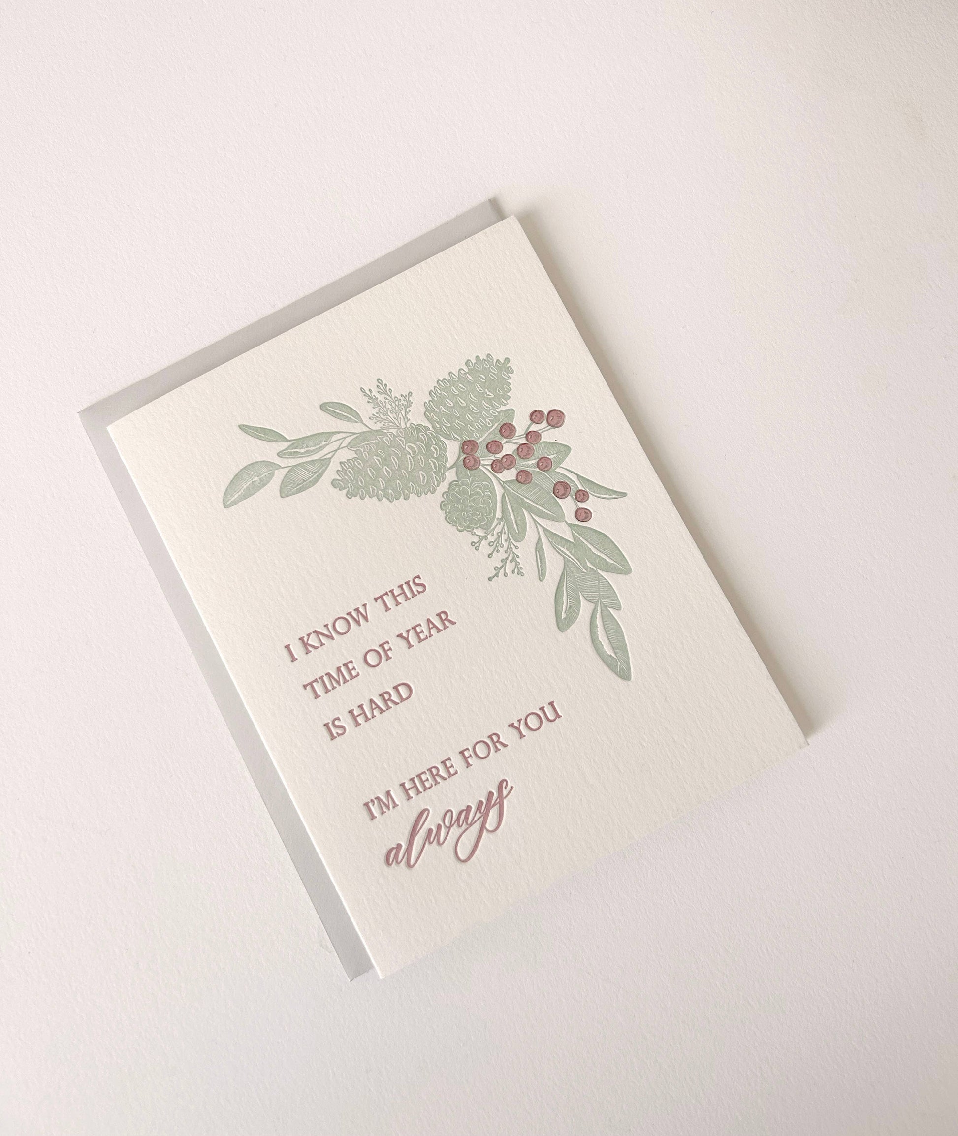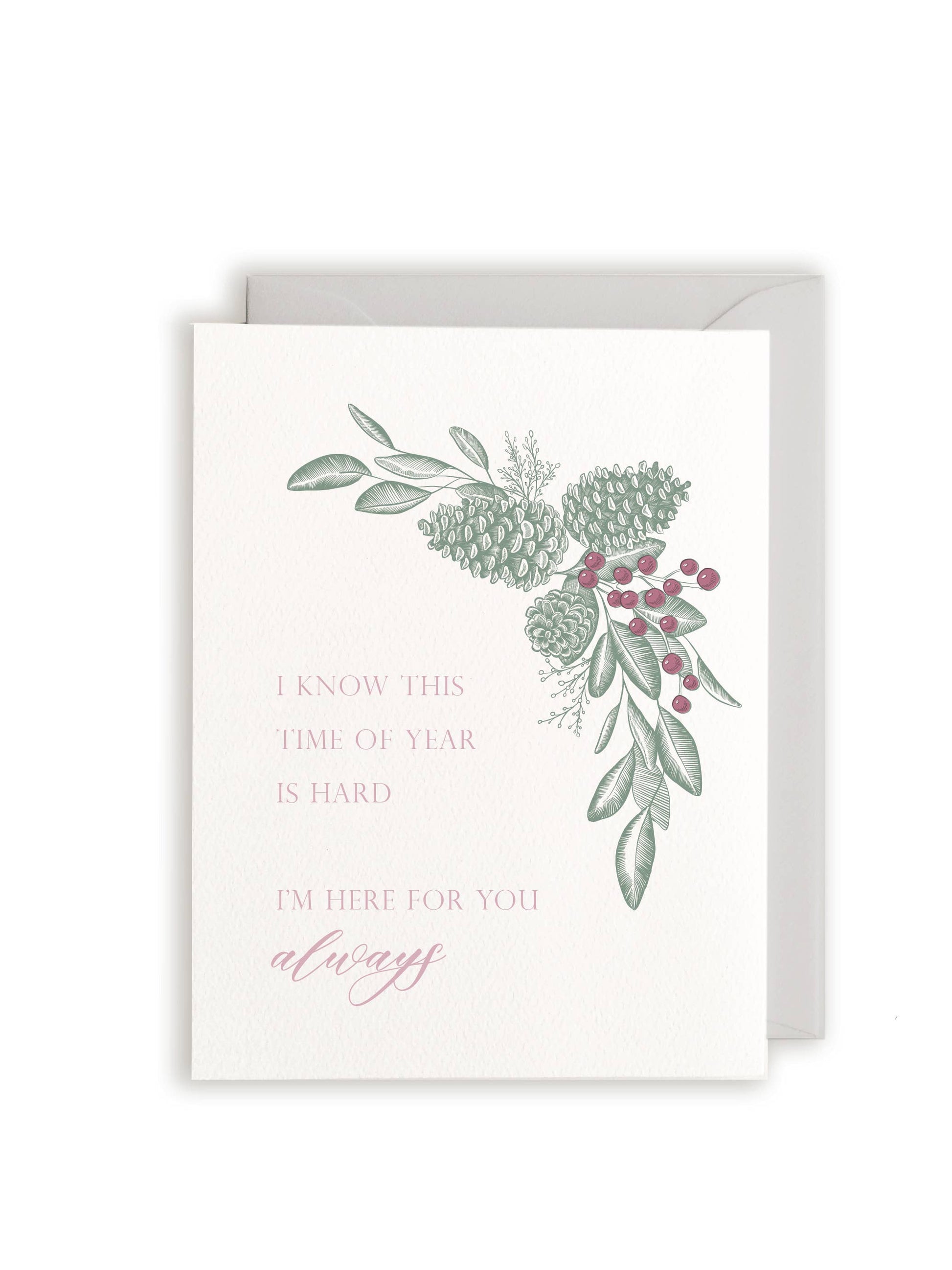 "I Know This Time Of Year Is Hard, I'm Here For You Always" Remind that special someone to keep going, never give up, and that you have their back. Original floral artwork created by Rust Belt Love. These two color cards are handmade and pressed one at a time on antique presses. Premium quality cotton paper.