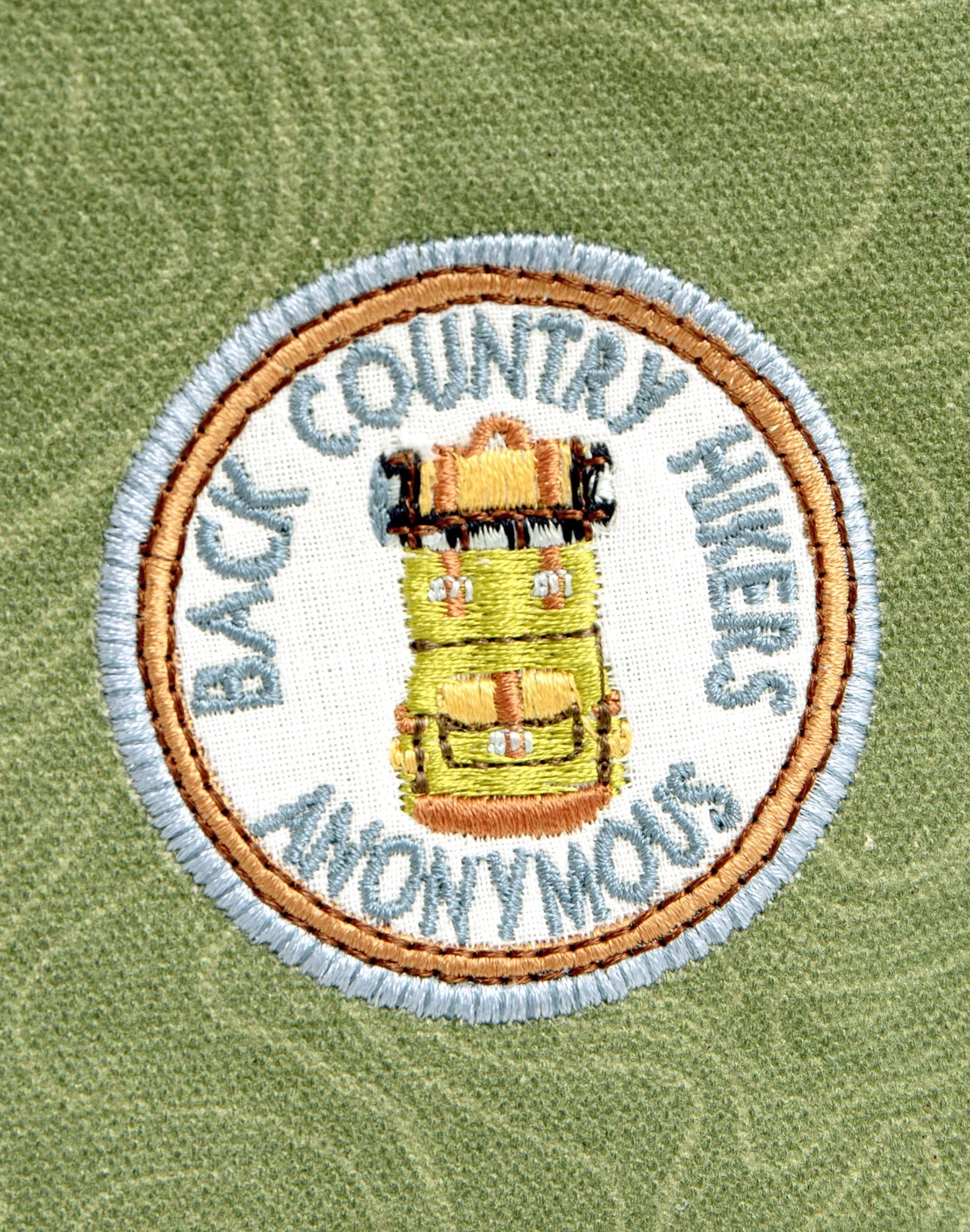 - Expanding bottom, embroidered emblem that reads: Back Country Hikers Anonymous