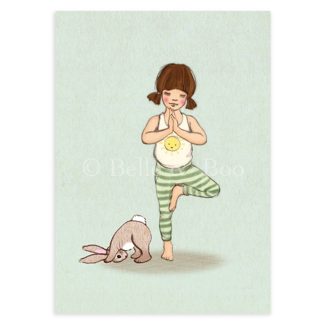 A postcard featuring Belle, a bobbed haired little girl and her bunny companion - Boo posed in a yoga tree pose. This enchanting card would be perfect to send to a yoga bunny friend or popped up on a shelf in a relaxing room.
