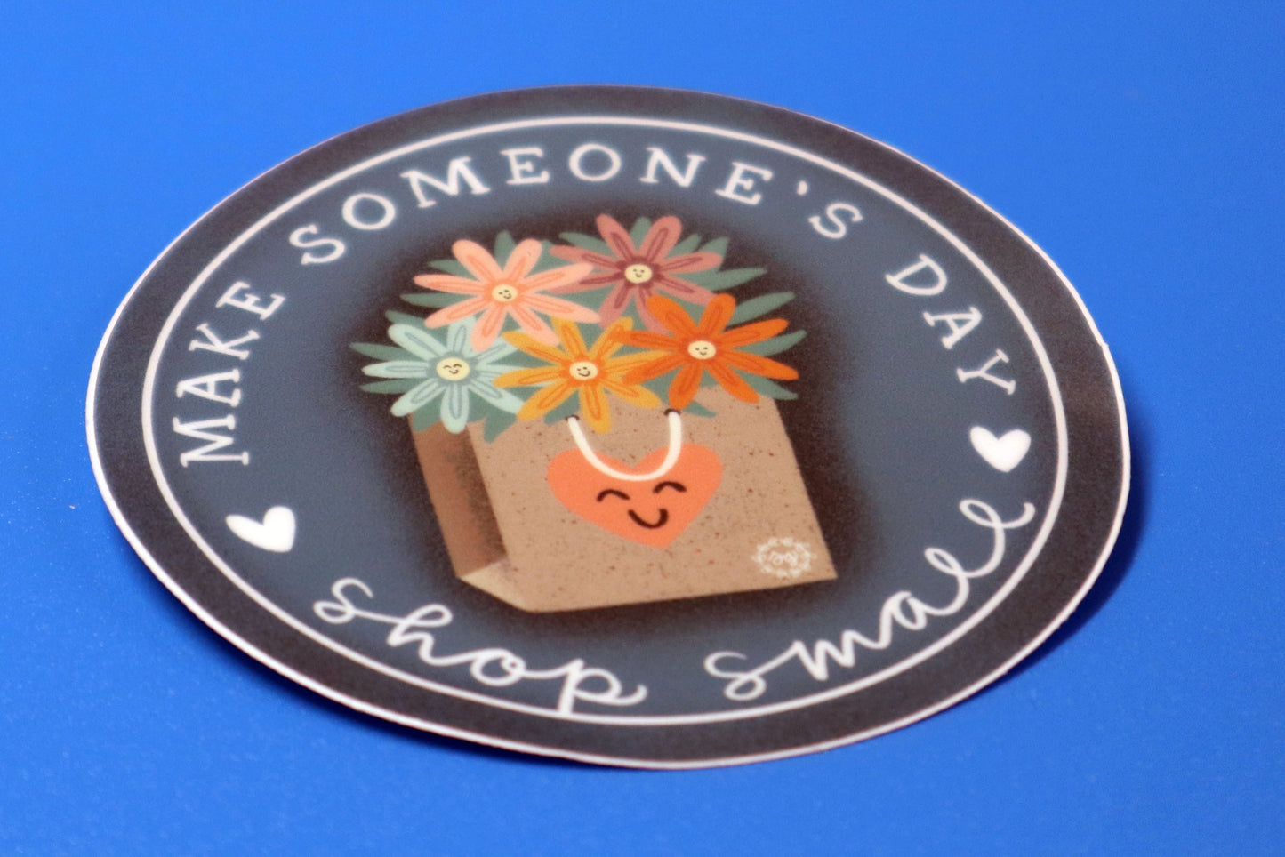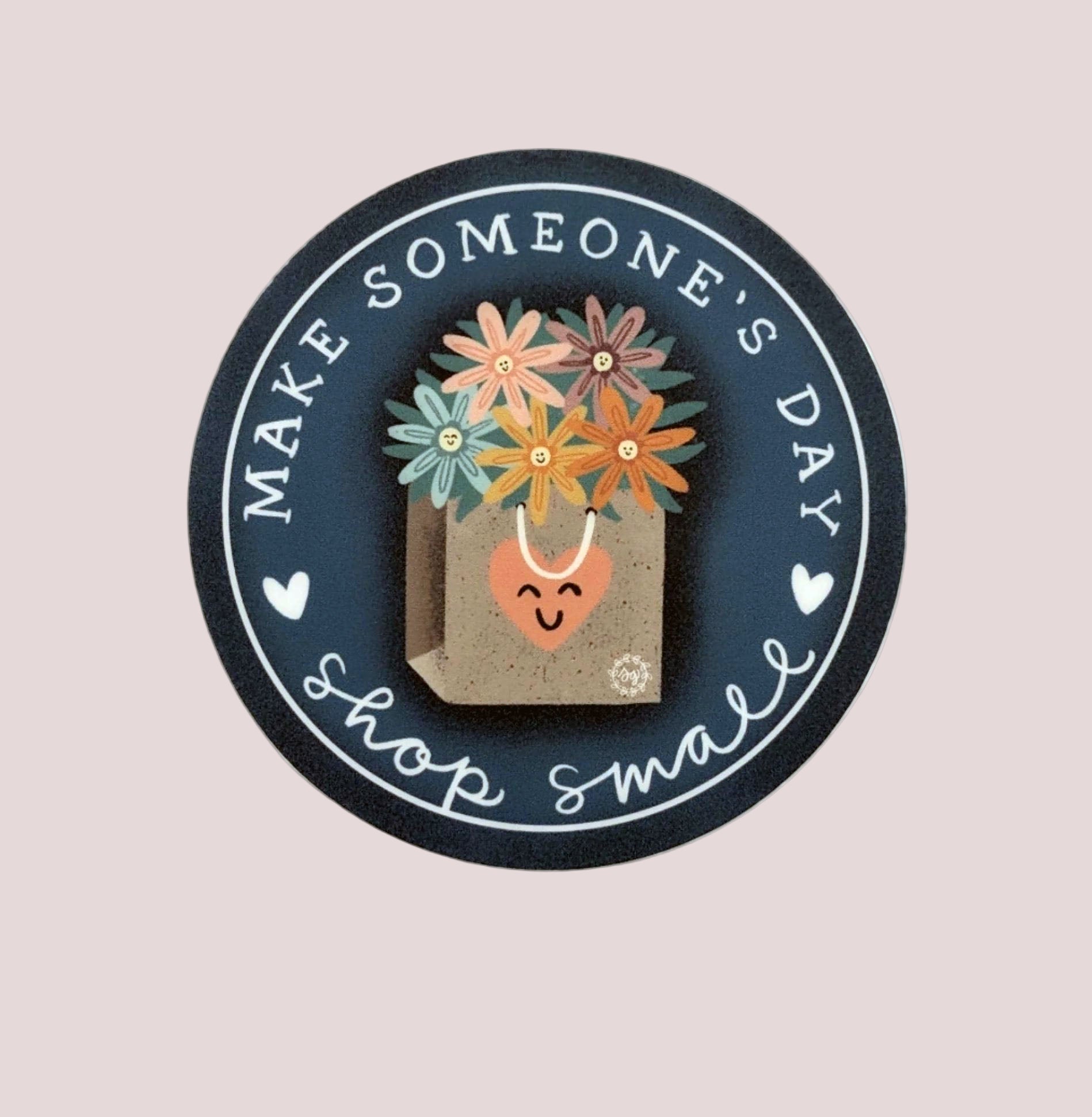"Make someone's day Shop Small" printed surrounding a bag with a heart and filled with flowers.