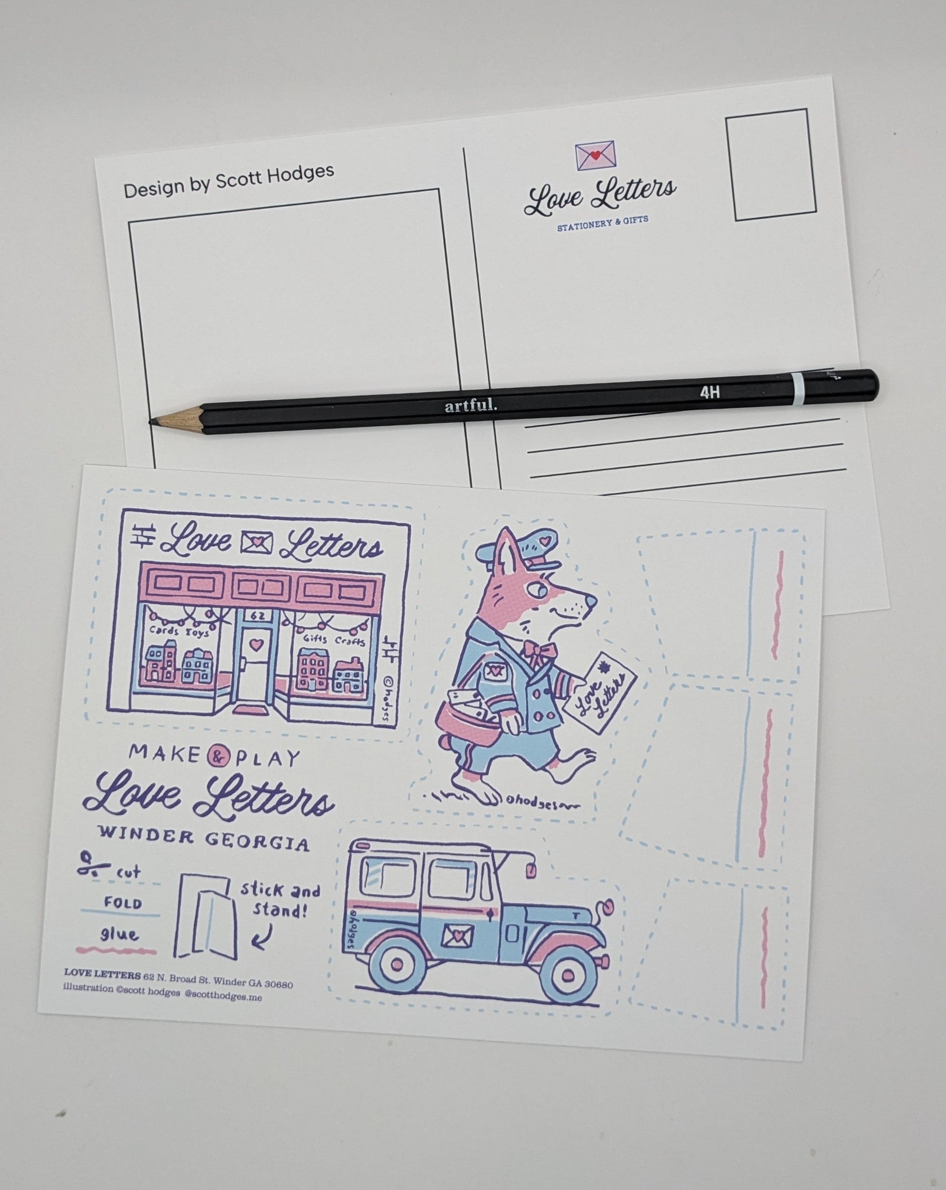 We had a postcard contest, and you delivered! This postcard by local artist Scott Hodges features illustrated characters that can be cut out and played with. Digital copy of original illustrations.