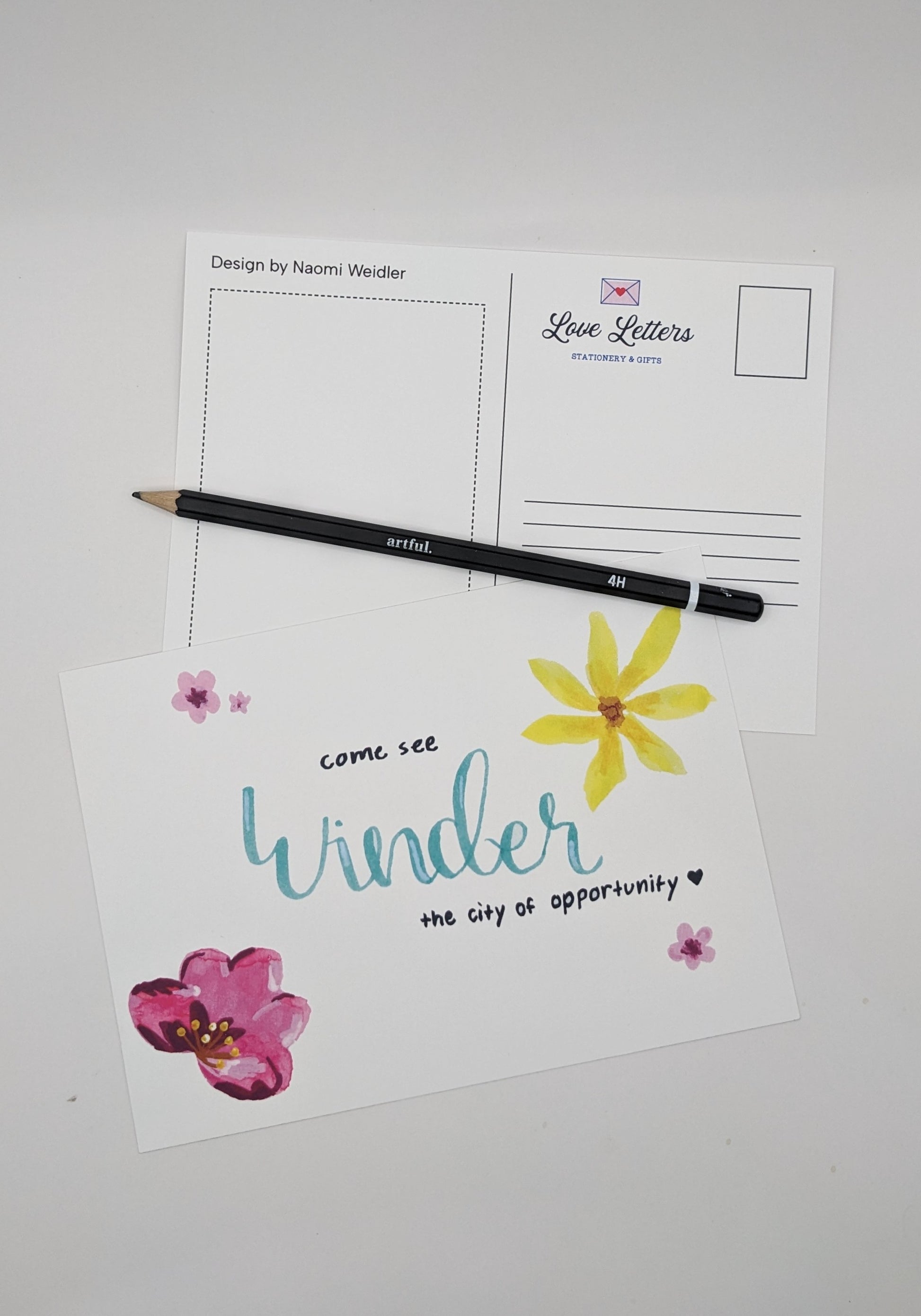 We had a postcard contest, and you delivered! This postcard by local teen artist Naomi Weidler features hand painted flowers with the message Come See Winder, The City of Opportunity in marker. Digital copy of original artwork done in acrylic paint and marker.