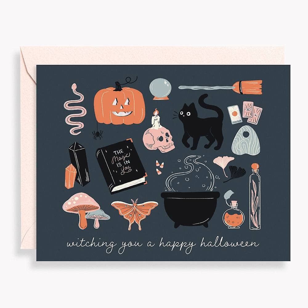 Witch someone a Happy Halloween with this spooky card. Features haunting icons and foil details. Blank inside for a personal message.