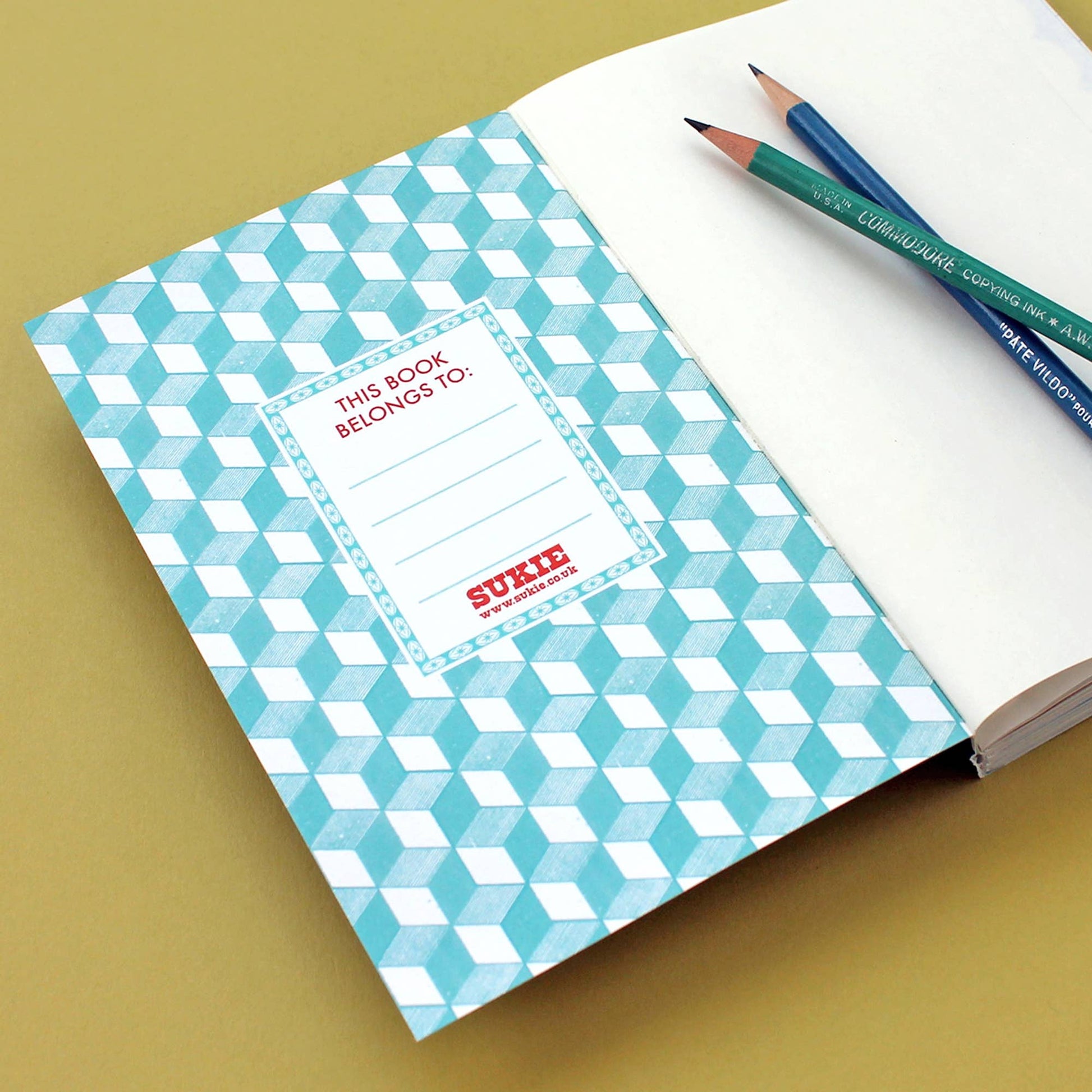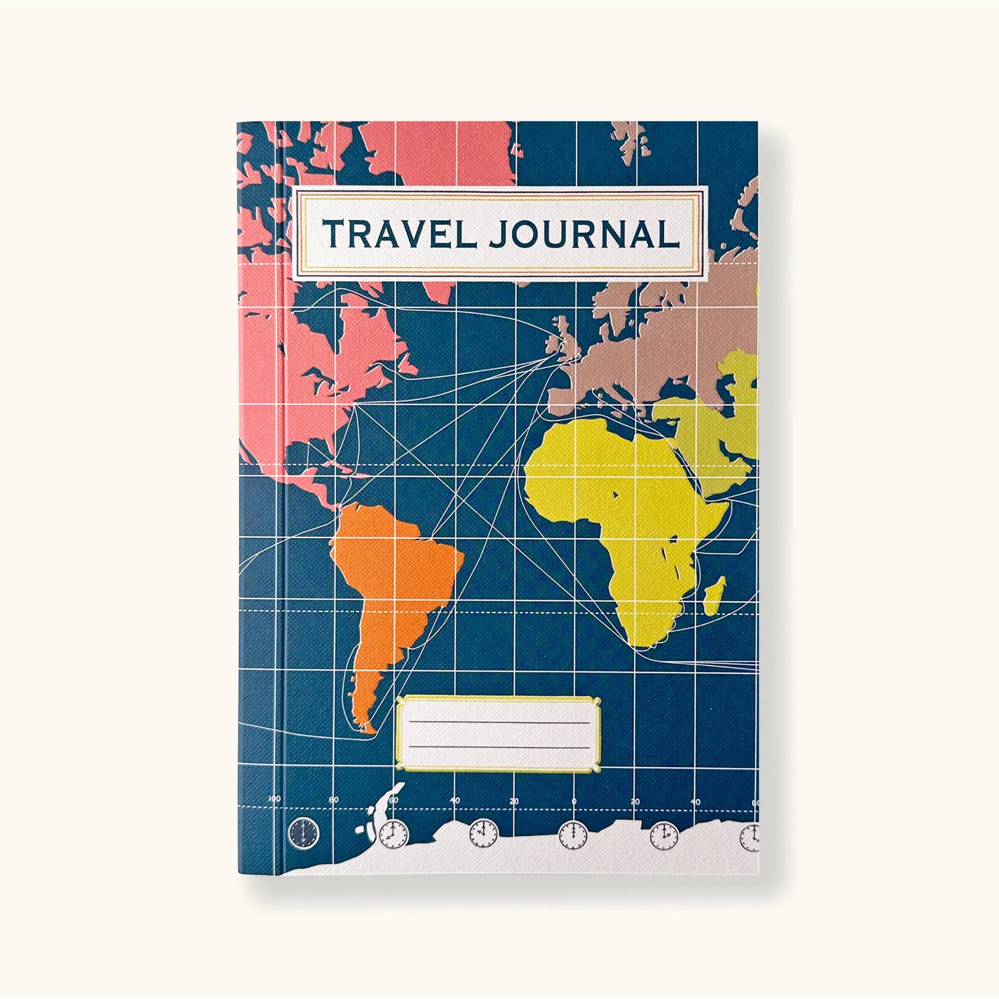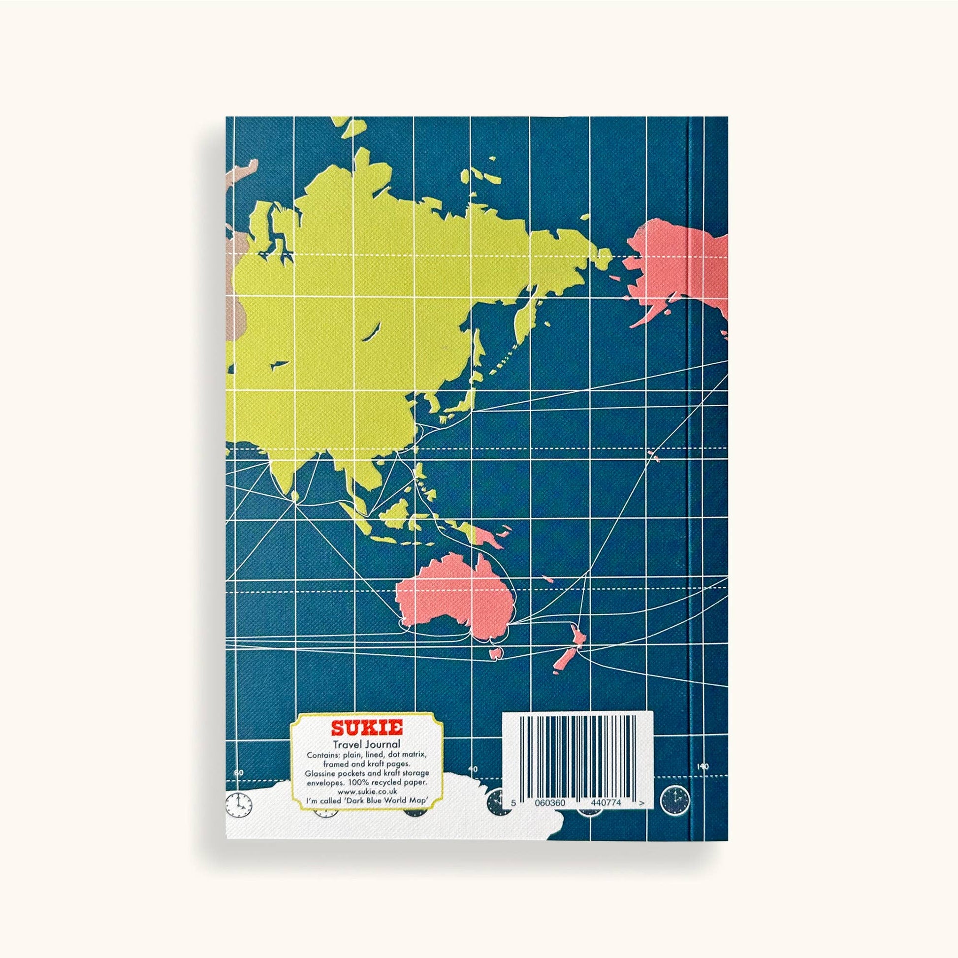 Travel Journals with a World map cover in a dark blue, image taken from one of Sukie's original lino cut prints. Book contains an assortment of lined, plain, dot, craft and framed papers as well as glassine pockets and manila envelopes. With thick smooth papers and a subtly textured card cover.