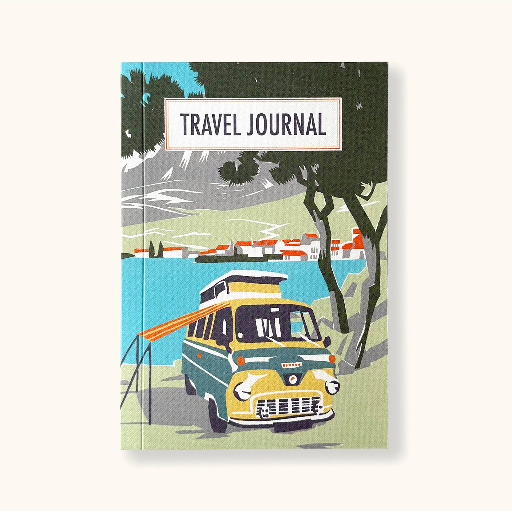 Travel Journal with a nostalgic Beach Camper design, image taken from one of our original lino cut prints. Book contains an assortment of lined, plain, dot, craft and framed papers as well as glassine pockets and manila envelopes. With thick smooth papers and a subtly textured card cover.