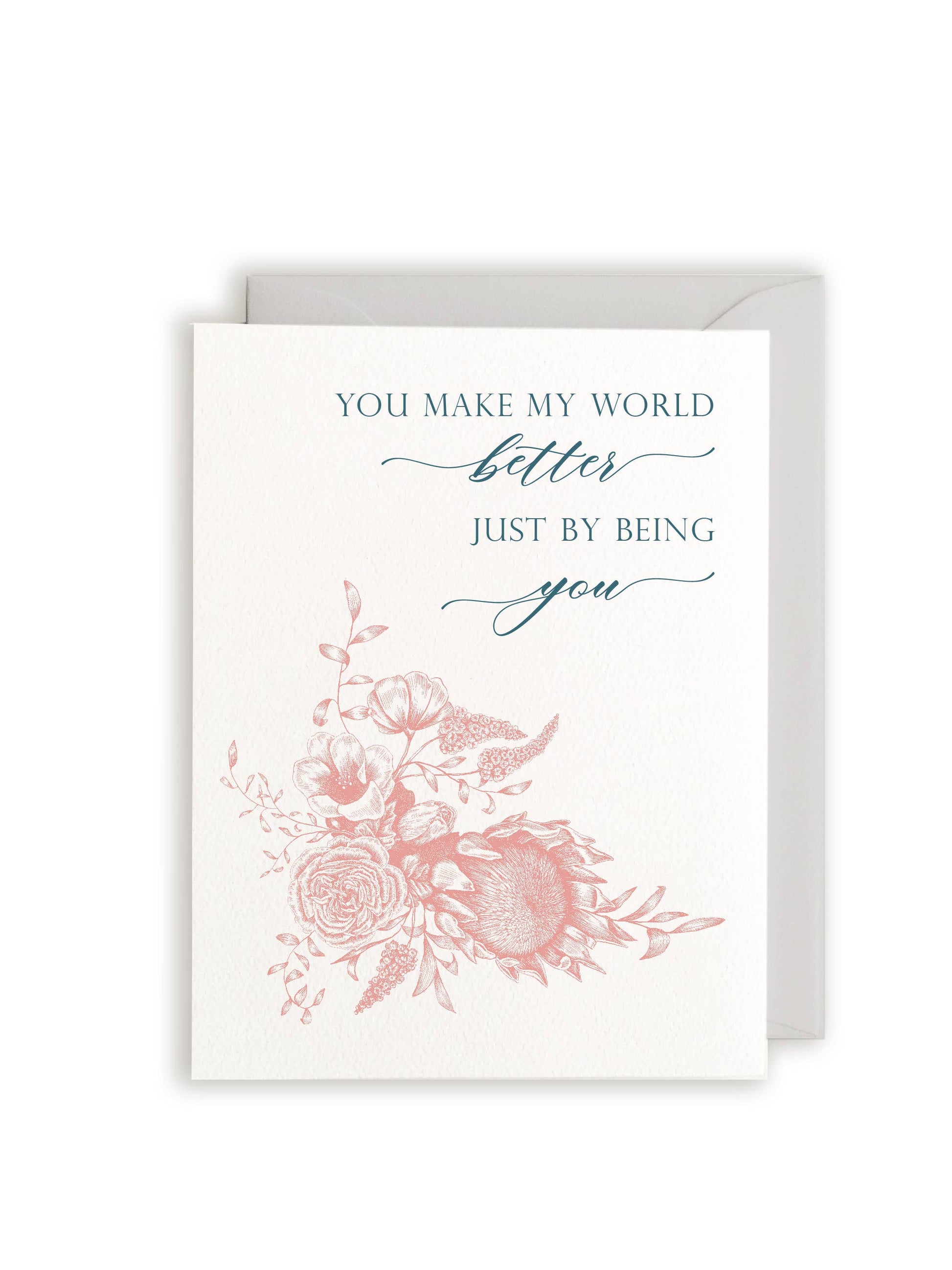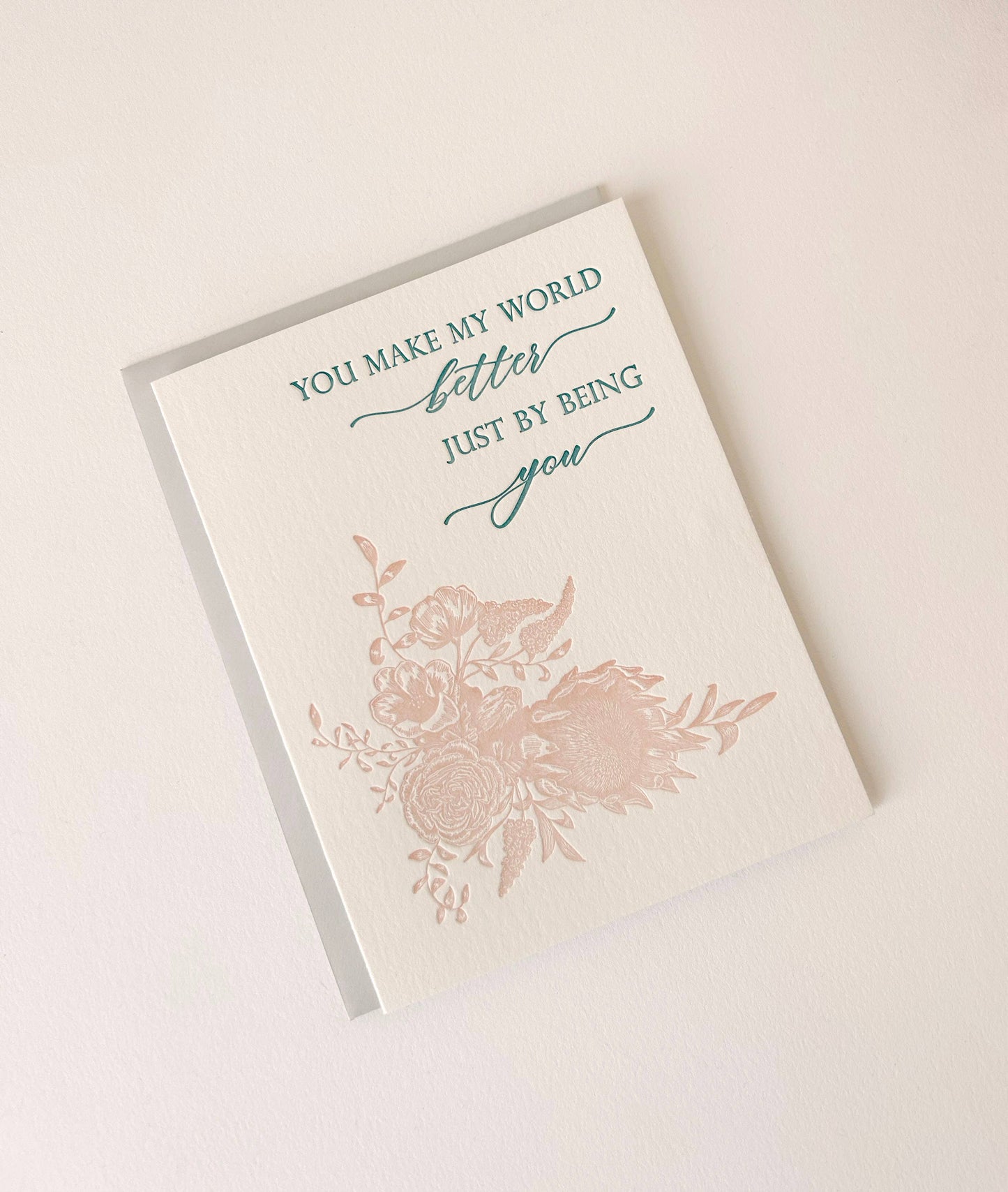 "You Make My World Better Just By Being You" Letterpress Greeting Card Sentimental letterpress greeting card to let someone special know that they are in your thoughts. Original floral artwork created by Rust Belt Love. These two color cards are handmade and pressed one at a time on antique presses. Premium quality cotton paper.